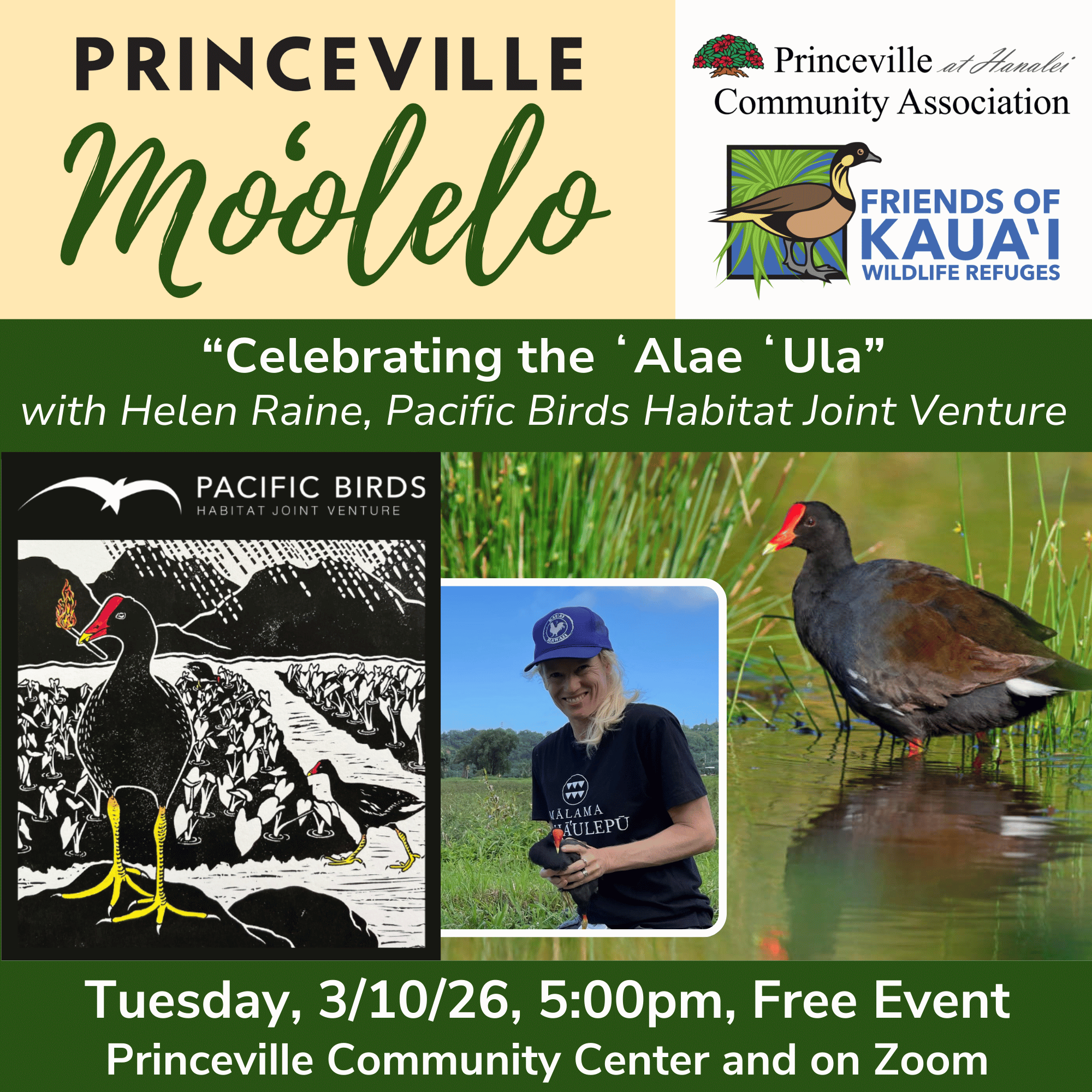 Our Princeville Moʻolelo free lecture series will continue on Tuesday, March 10th as we learn more about the ʻalae ʻula, an endangered Native Hawaiian waterbird that needs our kōkua.