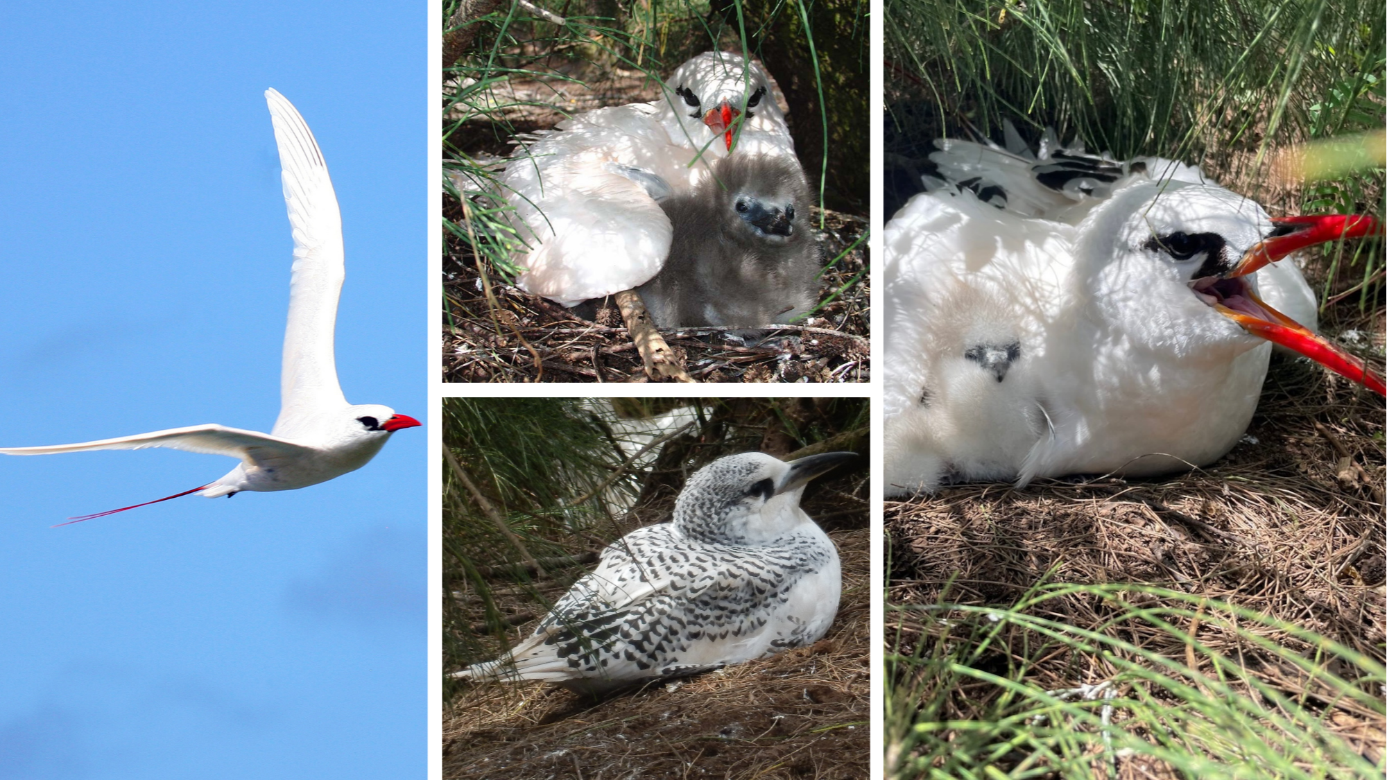 Photo: Koaʻe ʻula in flight, an adult with a chick at Kīlauea Point NWR, two chicks at various stages of development at Kīlauea Point NWR, Credit: USFWS, FKWR, PRC.
