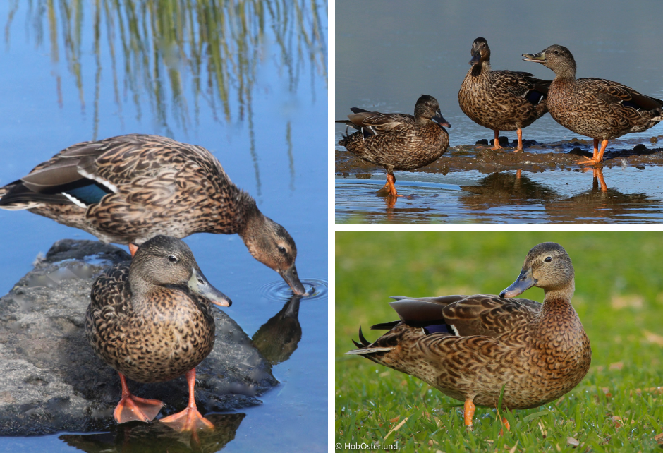 Koloa are medium-sized birds with mottled brown body feathers, iridescent green to blue wing bars, a spotted tail, and orange legs and feet. Their bill is dark greenish and can also feature an orange tip in some females. Koloa flush easily when disturbed and provide a delightful “quacking” sound as they take to flight, often in pairs.
