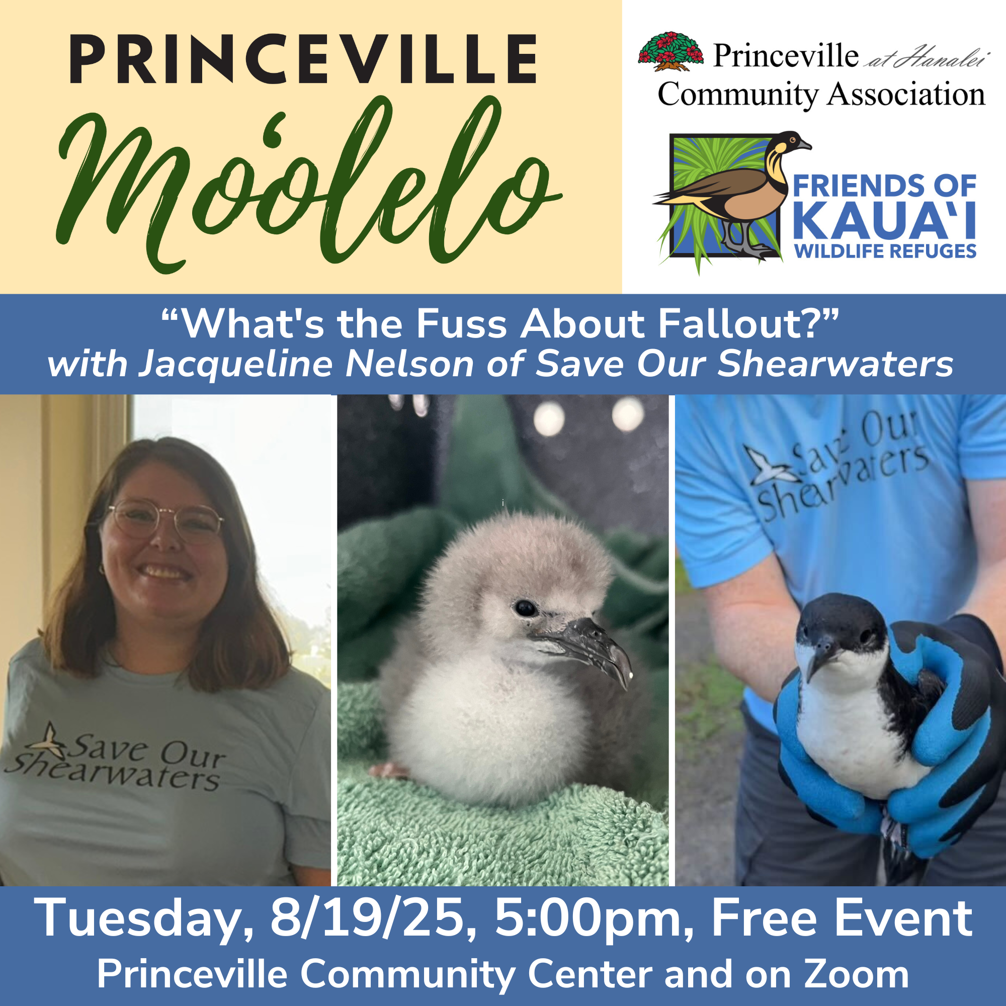 Our Princeville Moʻolelo free lecture series will continue on Tuesday, August 19, 2025, as Jacqueline Nelson, Program Manager with Save Our Shearwaters, returns with important information about how we can help protect seabirds.